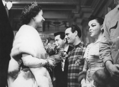 1957 After a sensational stage tour across the United States, Judy returned in triumph to London to play a five-week stand at The Dominion Theatre and appear in the "Royal Variety Show" in a command performance before Queen Elizabeth.