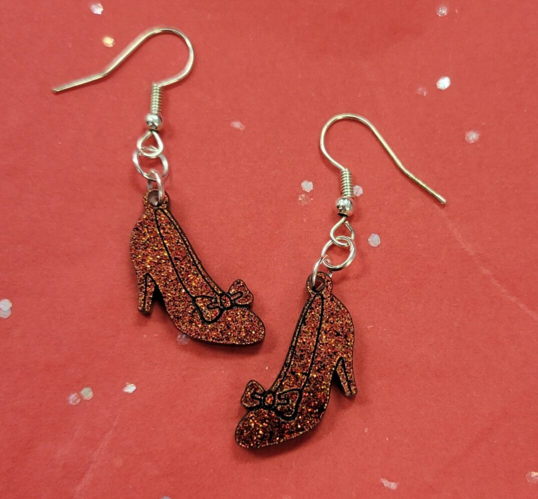 Locally Made, glittery acrylic Ruby Slipper Charm earrings. Hypo-Allergenic Metal Hooks